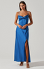 Indulge in the ultimate luxury of the Cannes Maxi Dress. With its corset style, the dress cinches in at the waist for a flattering silhouette. Complete with a sultry slit and crafted from satin material, this dress exudes sophistication and timeless elegance. Elevate your wardrobe with this exclusive piece.