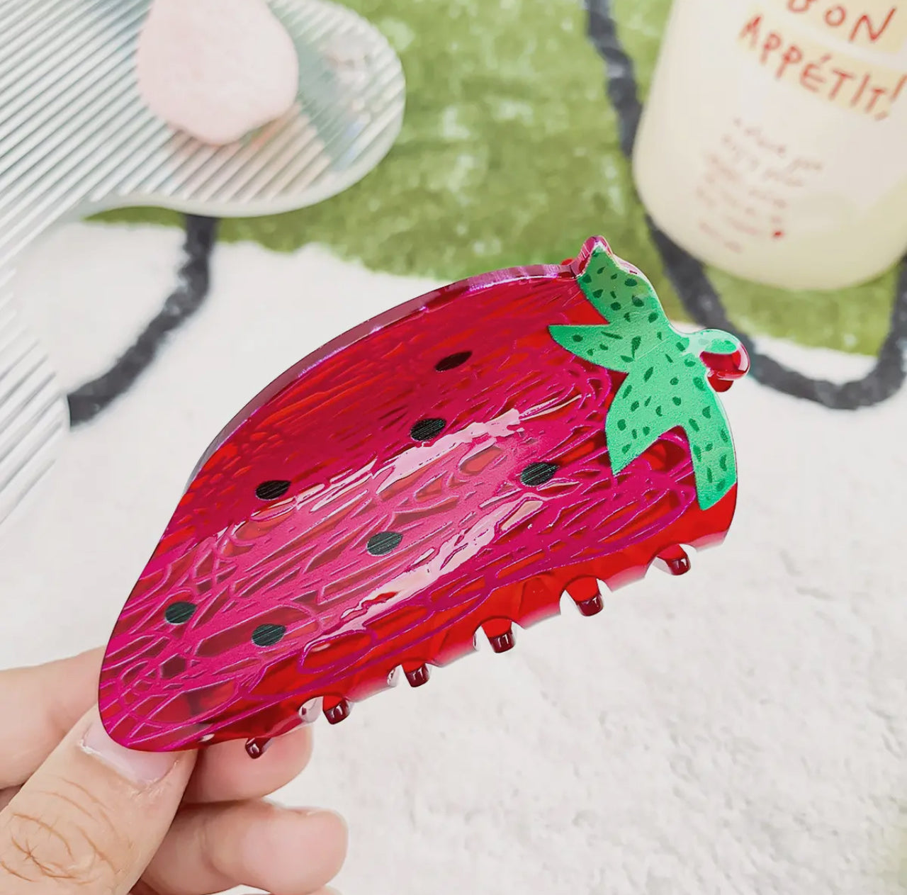 Add a juicy pop of color to your summer look with this Strawberry Claw Clip. Its fun design will hold your hair in place while you have a splash of playful charm. Perfect for any summer adventure!