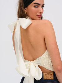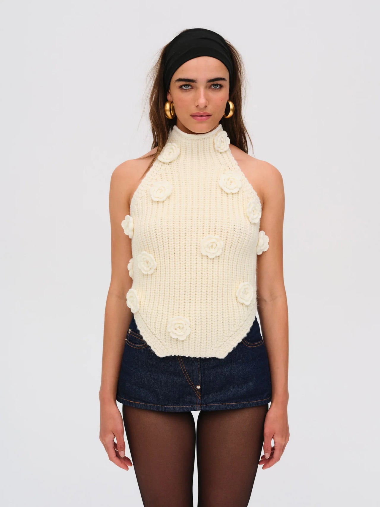 The Iliana Top is the perfect transitional knit for day and night. Crafted in a chunky knit, the standout feature of this halter top is its 3D knit flowers that exude a sense of romance. It's finished with large halter neck ribbon ties at the back and back waist.